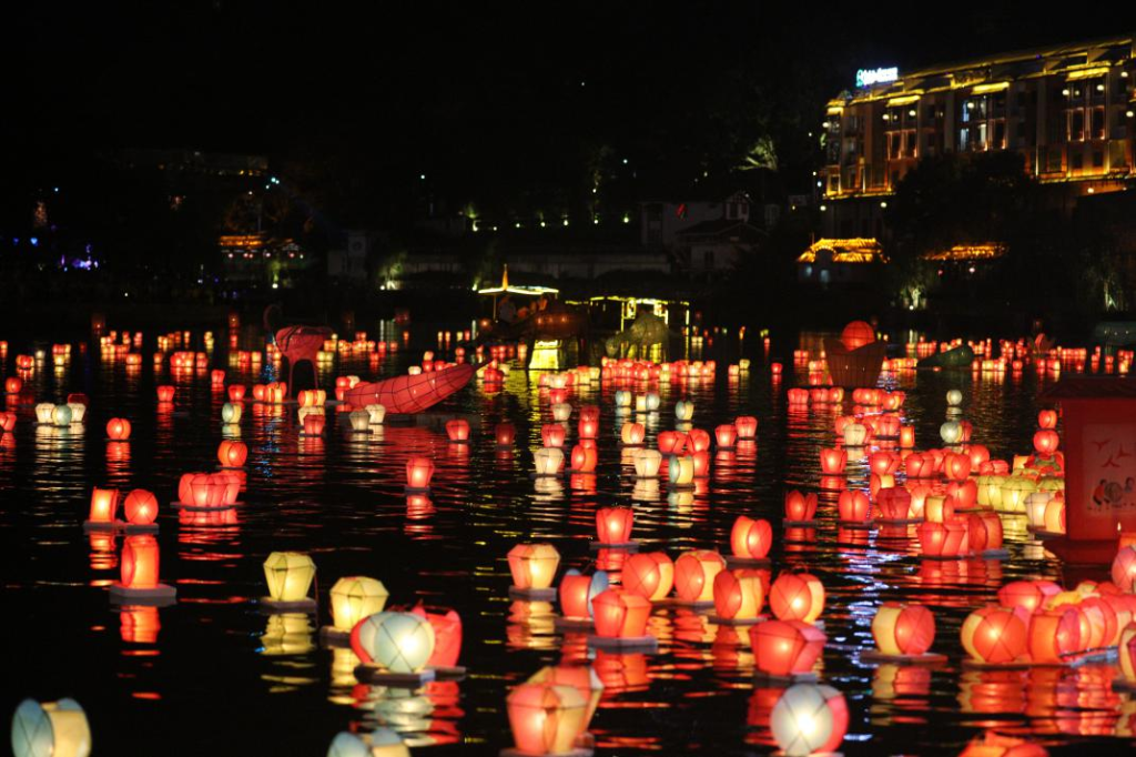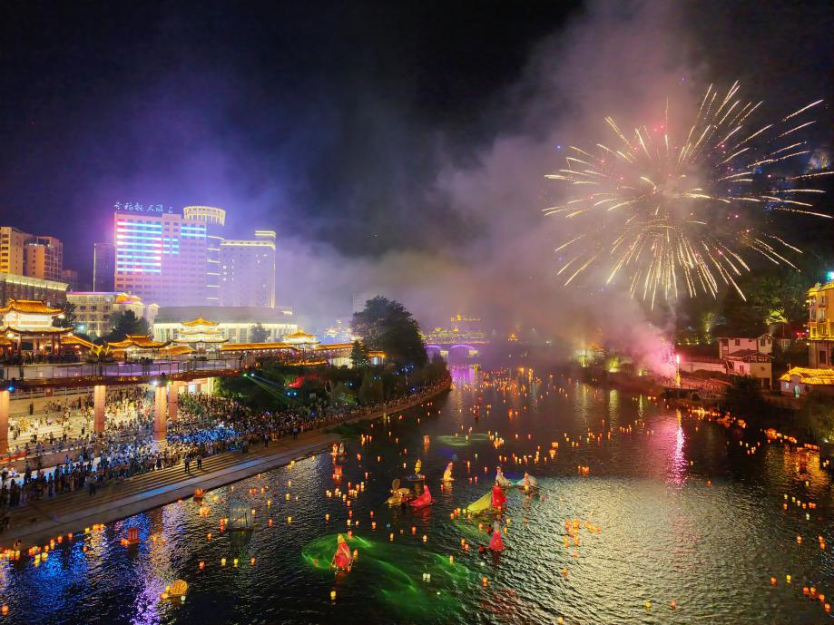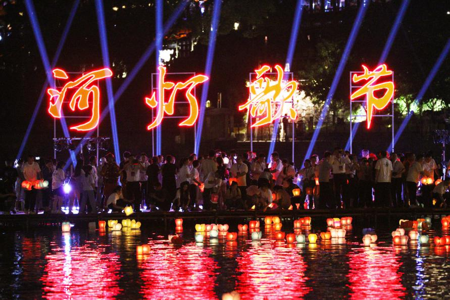 9月4日晚,广西桂林资源县举办第二十九届河灯歌节暨第十二届丹霞文化旅游节,当地群众及游客聚集在资江边,沿河放灯,寄托美好心愿。