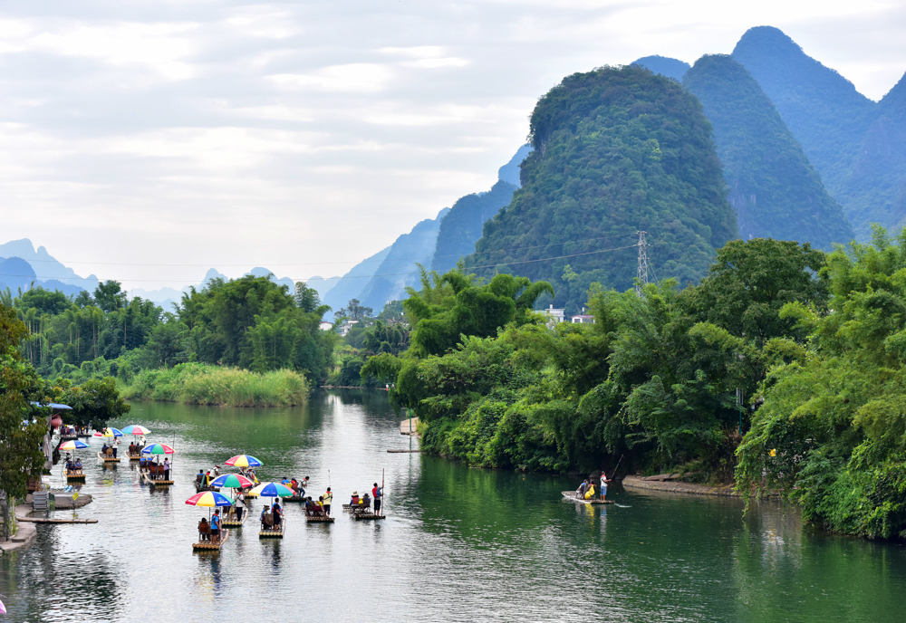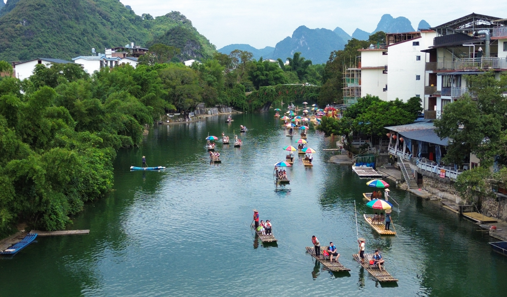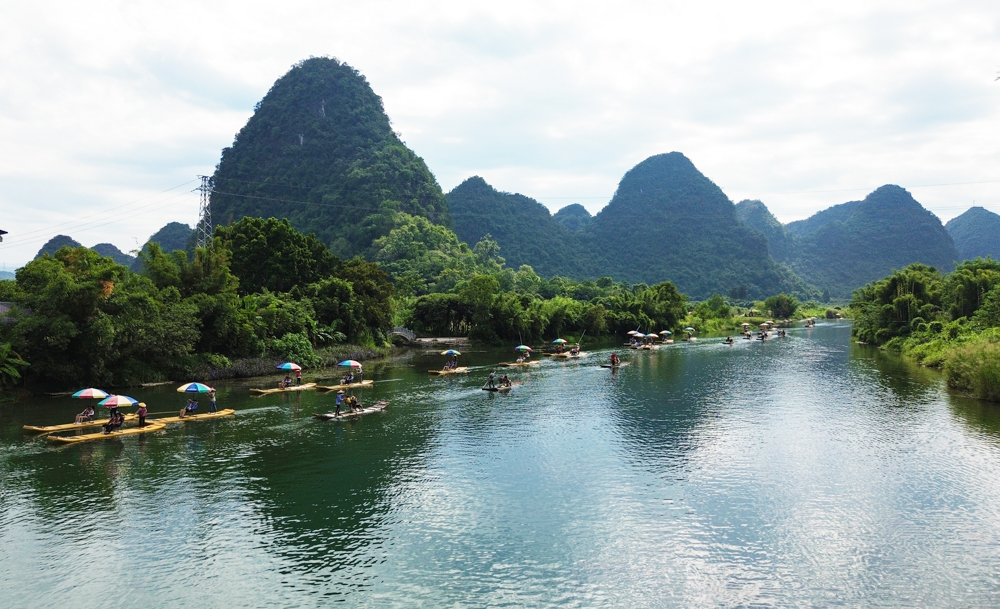 近期,广西桂林市阳朔县遇龙河风光如画,吸引众多游客前来游玩赏景,领略山水秋韵。