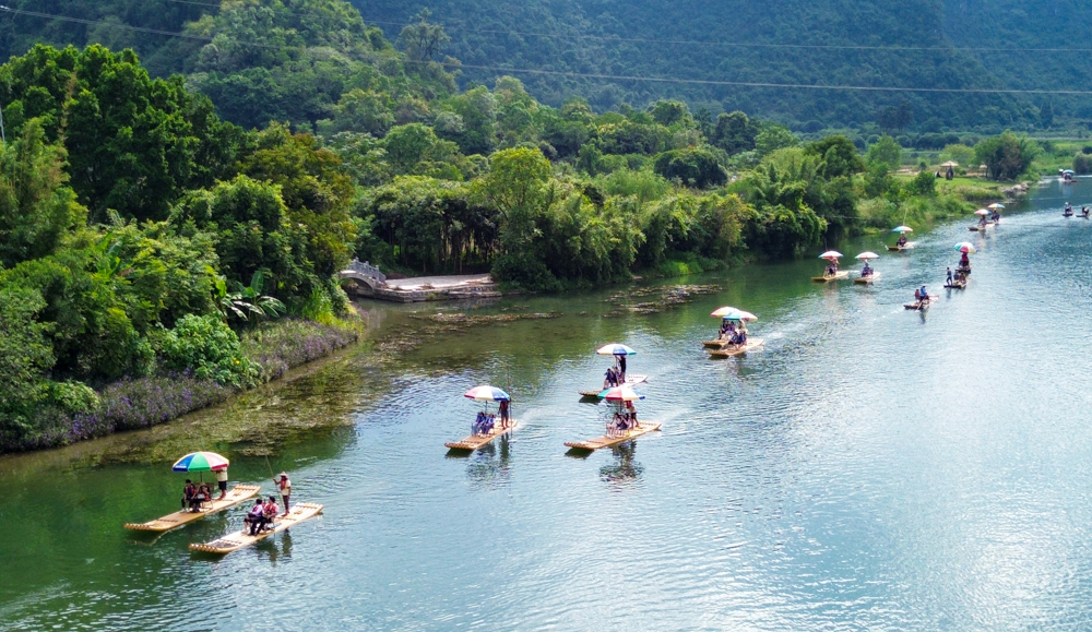 ↑2025年9月18日,游人在广西桂林市阳朔县遇龙河乘坐竹筏游览观景。(无人机照片)CICPHOTO/廖祖平 摄