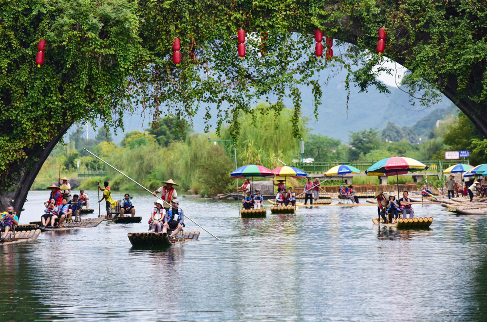 ↑2025年9月18日,游人在广西桂林市阳朔县遇龙河乘坐竹筏穿过遇龙古桥。CICPHOTO/廖祖平 摄