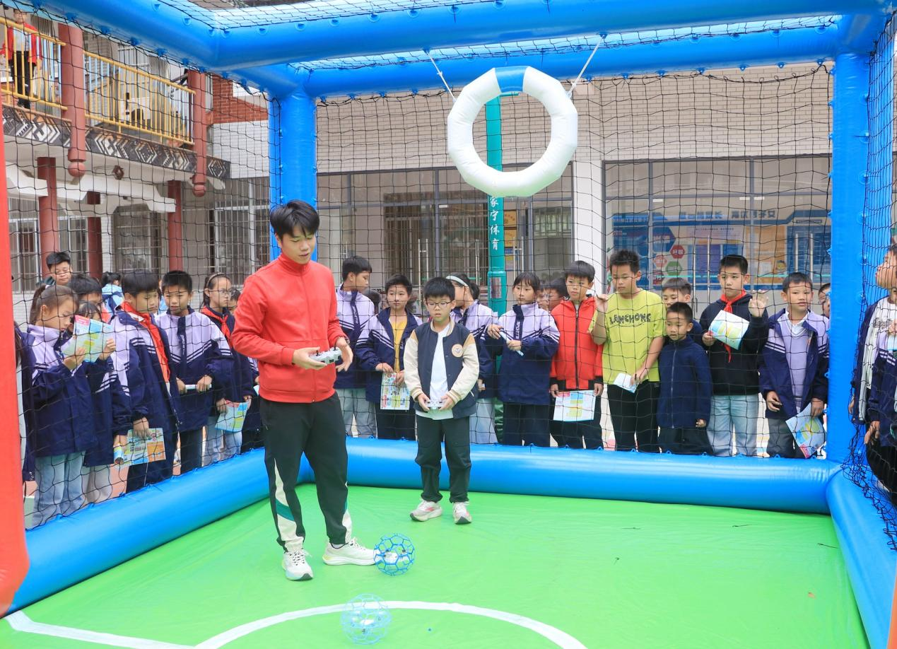 “左手控制高度,右手调整方向,轻轻推摇杆就可以飞行。”在实操体验环节,志愿者们搭建起专属体验区,指导学生们操控无人机足球,让同学们在实践中锻炼逻辑思维与动手能力。