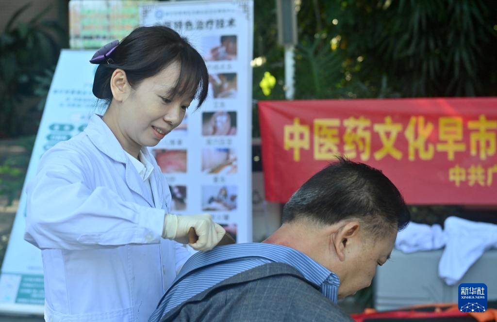 11月14日,在广西南宁市金花茶公园,医务工作者为市民刮痧。