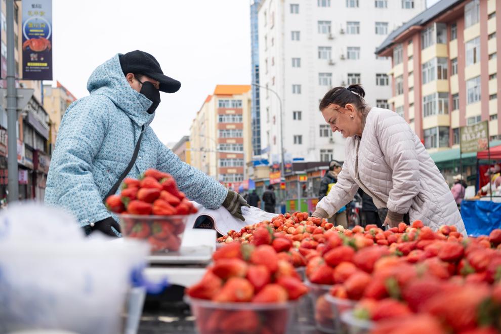 2025年3月20日,在黑河市文化街早市,一名俄罗斯游客在选购水果。新华社记者 谢剑飞 摄