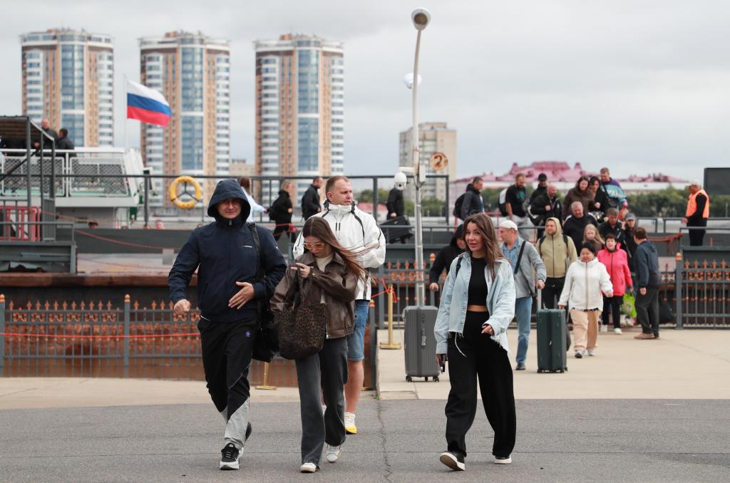 2025年9月15日,俄罗斯免签旅客从黑龙江省黑河水运旅检口岸入境,走向联检大厅。新华社发(刘松 摄)