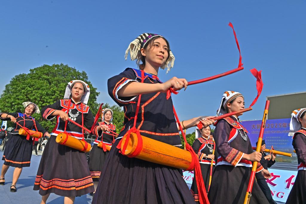 2025年10月17日,群众在大新县2025年中越边关侬峒文化旅游嘉年华民俗风情巡游中。新华社记者 周华 摄