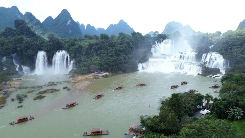 2025年10月18日,在广西崇左市大新县中越德天(板约)瀑布跨境旅游合作区,游人乘坐竹筏游览(无人机照片)。新华社发(廖祖平 摄)