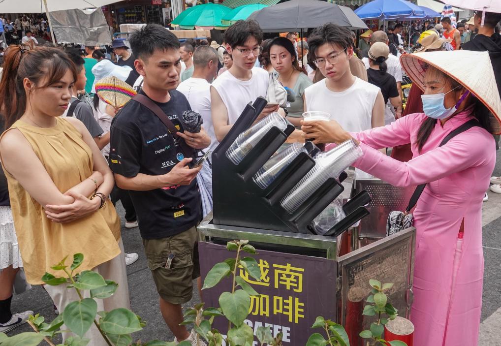 2025年5月4日,游客在广西防城港东兴市国门景区购买越南咖啡。新华社发(刘峥 摄)